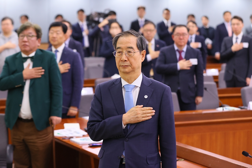 한덕수 국무총리가 10일 서울 종로구 정부서울청사에서 열린 ‘2050탄소중립녹색성장위원회 전체회의’에서 국기에 대한 경례를 하고 있다.