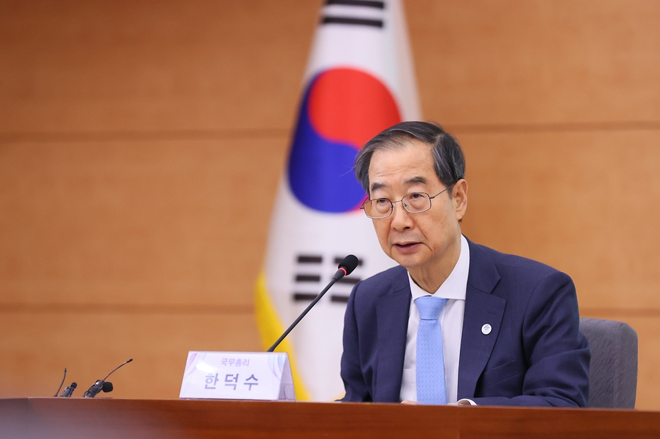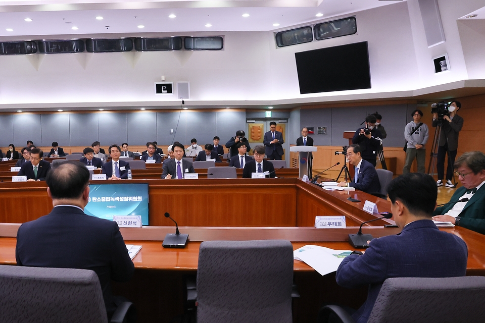 한덕수 국무총리가 10일 서울 종로구 정부서울청사에서 열린 ‘2050탄소중립녹색성장위원회 전체회의’를 주재하고 있다.