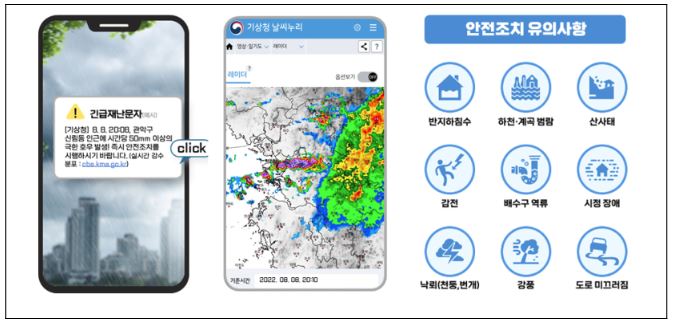 ㅇ 특히 “이번 달부터 기상청이 재난문자를 직접 발송하게 되어 집중호우 시 사고 발생으로부터 20분 정도 추가 골든타임을 확보할 수 있게 되었다”며 “실제 상황에서 시행 착오가 없도록 만반의 준비를 할 것”을 주문하였다.