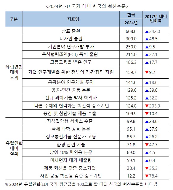 우리나라는 19개 평가지표 중 11개 지표에서 유럽연합 평균 대비 우수(100점 이상)한 것으로 나타났으며 특히, 상표 출원(608.6점), 디자인 출원(309.0점), 기업분야 연구개발 투자(250.0점) 지표에서 우위를 보인 반면, 제품혁신 도입 중소기업(28.4점), 사업 공정혁신 도입 중소기업(12.2점), 미세먼지 대기 방출량(59.1점) 등의 지표에서 열세를 보였다.