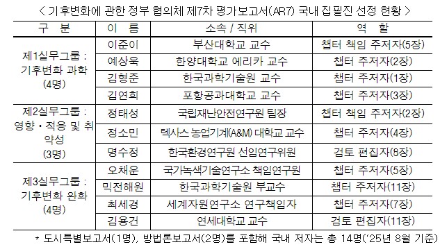 기후변화에 관한 정부 간 협의체 사무국은 195개국 정부로부터 총 3,771명 이상의 전문가 추천을 받았으며, 전문성·지역 대표성·성별 균형 등을 고려한 심사를 거쳐 최종 664명의 저자를 선정하였다. 제7차 평가보고서 작성에 참여하는 총 저자 수가 제6차 평가보고서 대비 139명(17%) 감소한 가운데 국내 저자 수는 11명으로 동일하게 유지되어, 비중은 오히려 소폭 상승하였다. 저자로 확정된 국내 전문가 총 11명은 챕터 책임 주저자(Coordinating Lead Author)로 선정된 이준이 부산대학교 교수와 정태성 국립재난안전연구원 기후영향분석팀장을 비롯하여, 챕터 주저자(Lead Author) 7명과 검토 편집자(Review Editor) 2명으로 각각 구분되어 활동하게 된다.