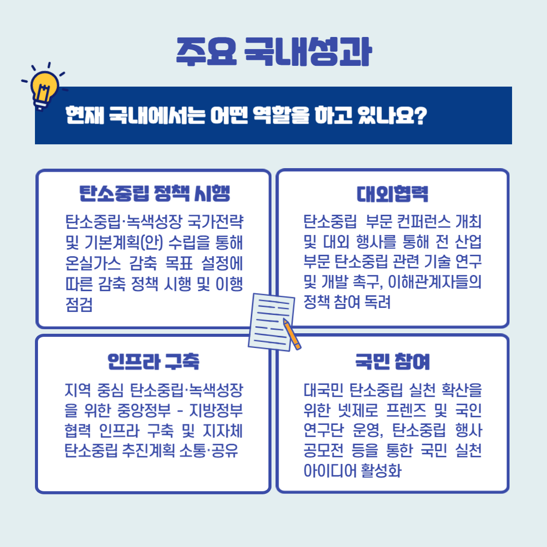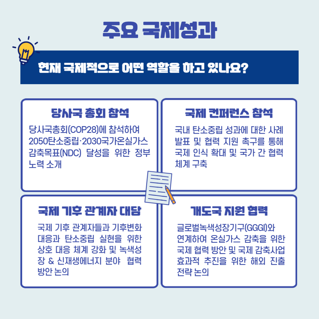 국제적으로는 매년 열리고 있는 유엔기후변화협약 당사국총회(COP)에 참석하여 국내 탄소중립 성과를 소개하고 2030국가온실가스 감축목표(NDC)의 달성을 위한 정부 활동을 함께 알리고 있다. 그 밖에도 국제 컨퍼런스에 참석하여 지속적으로 국내 사례 소개를 통해 국가 간의 협력관계를 구축하고 있고 해외 기후 관계자들과의 대담을 통해 다양한 협력 방안을 모색하며 대외 인프라도 구축하고 있다. 또한 탄소중립과 녹색성장 선도를 목표로써 온실가스 감축 지원이 필요한 개도국에 대한 지원 계획도 추진 중이다. 국가 탄소중립녹색성장 비전과 목표를 위해 탄녹위는 대통령직속 핵심 기구로서 기능하고 있으며, 그에 맞춰 정부 & 기업 & 개인의 역할에 대한 교육과 홍보도 추진하고 있다. 2050년까지 전 지구적 과제인 탄소중립 목표를 달성하기 위해 우리 정부와 기업, 국민은 각각 어떤 노력을 해야 할까?