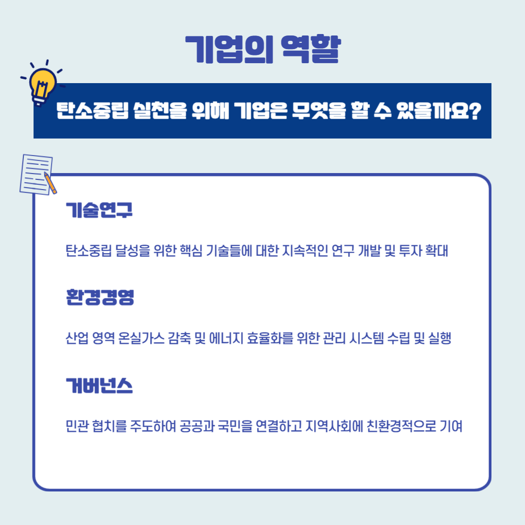 기업 역시 온실가스 인벤토리 구축을 통한 감축을 의무 또는 규제로만 인식할 것이 아니라 기업이 주도적으로 감축을 위해 노력하고 산업 전반적으로 탄소중립을 위한 노력을 해야 한다. 부의 지원만 바라볼 것이 아닌 기업이 자체적으로 할 수 있는 부분에 대해서도 고민이 필요하고 그 결과들이 기업의 경영 전략에 녹여 운영해야 한다.