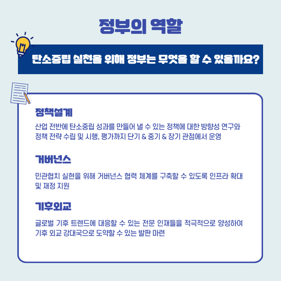 정부는 탄소중립녹색성장 전 부문에 대한 정책설계는 물론이고 국가 재정을 집행하는 부분에서도 적극적인 지원책을 마련해야 한다. 그리고 외교적으로도 우리의 성과를 소개하고 협력관계를 구축하는 것을 넘어서 탄소중립 부문의 선도 국가로서 나아가기 위해서는 대내외 인프라 구축이 탄탄해야 할 것이다.