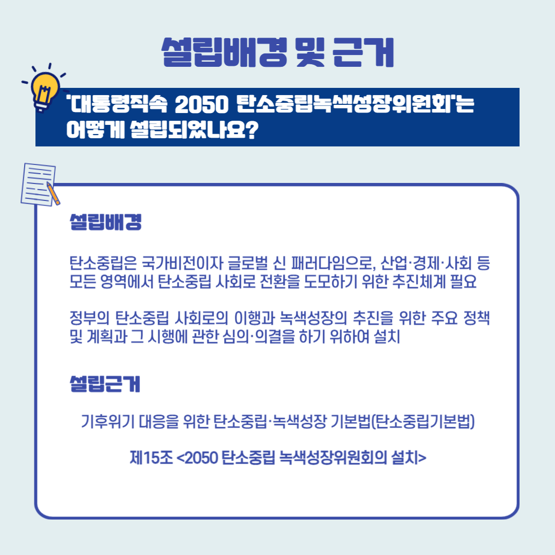 안녕하세요, 이동호 기자입니다. 이번 글은 <대통령직속 2050 탄소중립녹색성장위원회> 소개로 찾아왔습니다. 탄소중립녹색성장위원회(이하 탄녹위)의 설립 배경 및 근거, 성과 그리고 탄녹위의 비전에 맞춰 각 영역에서 어떤 역할을 할 수 있는지 살펴보려고 합니다.