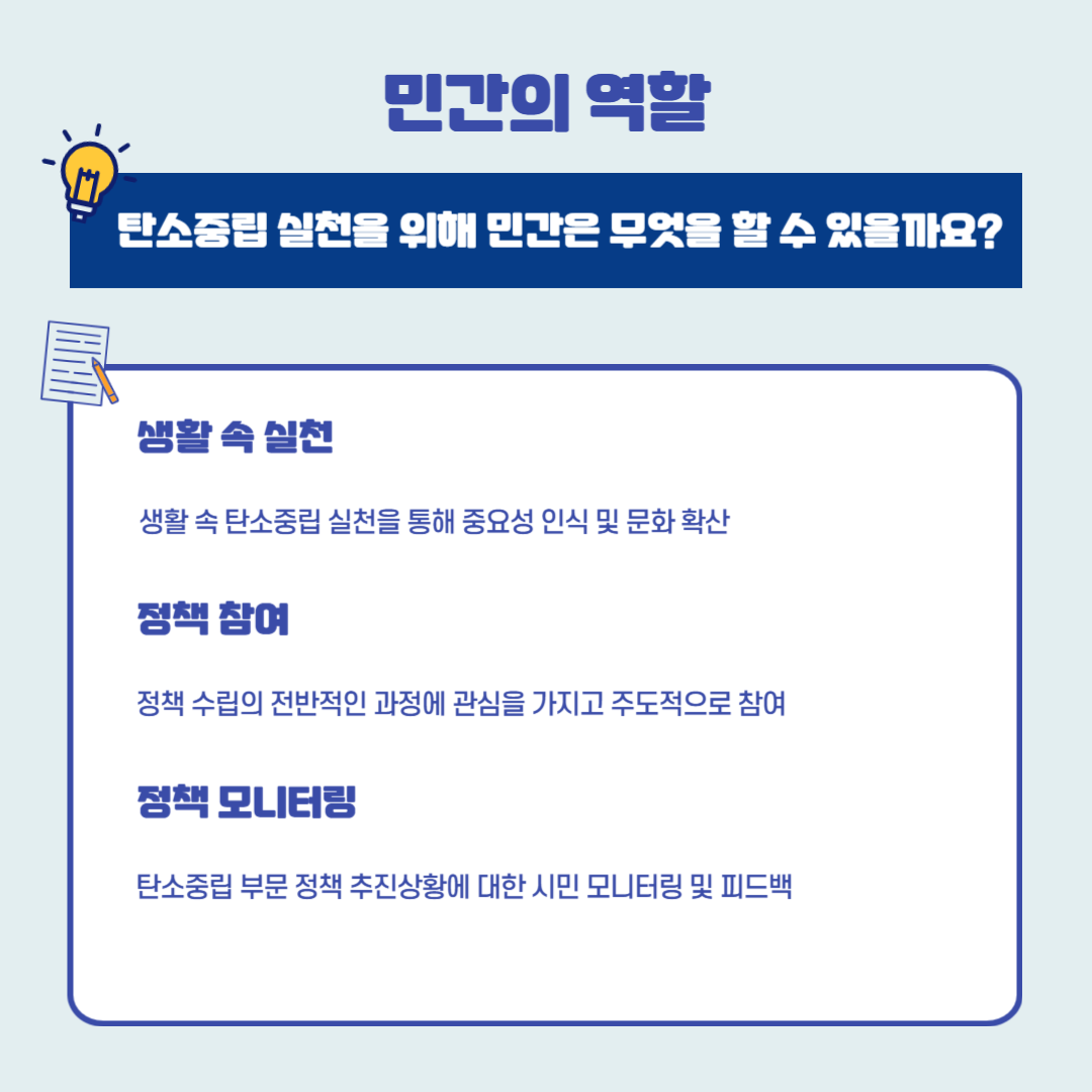 마지막으로 민간 부분에서 가장 중요한 것은 인식 확산과 적극적 실천이다. 개인의 생활 속에서 온실가스를 발생시키는 행동들을 줄이고 탄소중립의 필요성을 인식하여 실천 행동으로 옮겨야 한다. 국민이 인식하고 있으면 정부나 기업 역시 탄소중립을 위한 노력에 있어 더욱 탄력을 받을 수밖에 없고 이에 발맞춰 지속적인 정책 모니터링을 통해 그 성과가 지속적으로 유지될 수 있도록 국민의 관심과 행동이 절실한 상황이다.