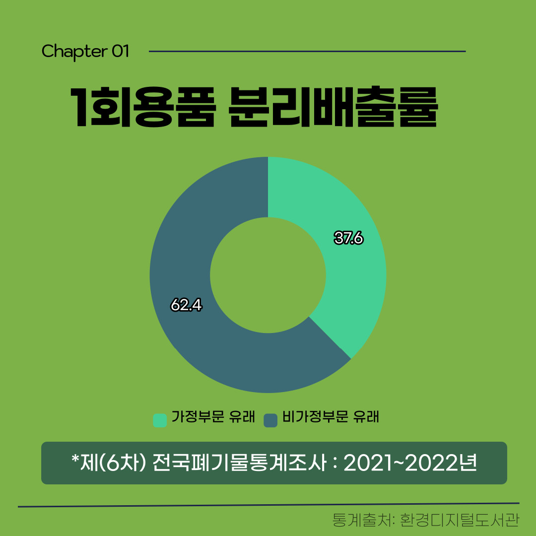 1회용품 줄이기에 열을 올리고 있는 흐름 가운데, 우리는 왜 가정에서 1회용품 줄이기를 실천해야 할까요? 제6차 전국폐기물통계조사에 따르면 2021년부터 2022년까지 한국 가정에서 유래하는 1회용품 분리배출률은 약 37.6%에 달했습니다. 전체 1회용품 분리배출률에서 40%에 가까운 수치가 가정 부문에서 발생한다는 사실은, 1회용품 사용감소에 있어서 ‘가정 내 1회용품 사용줄이기’가 반드시 요구된다는 점을 시사합니다.