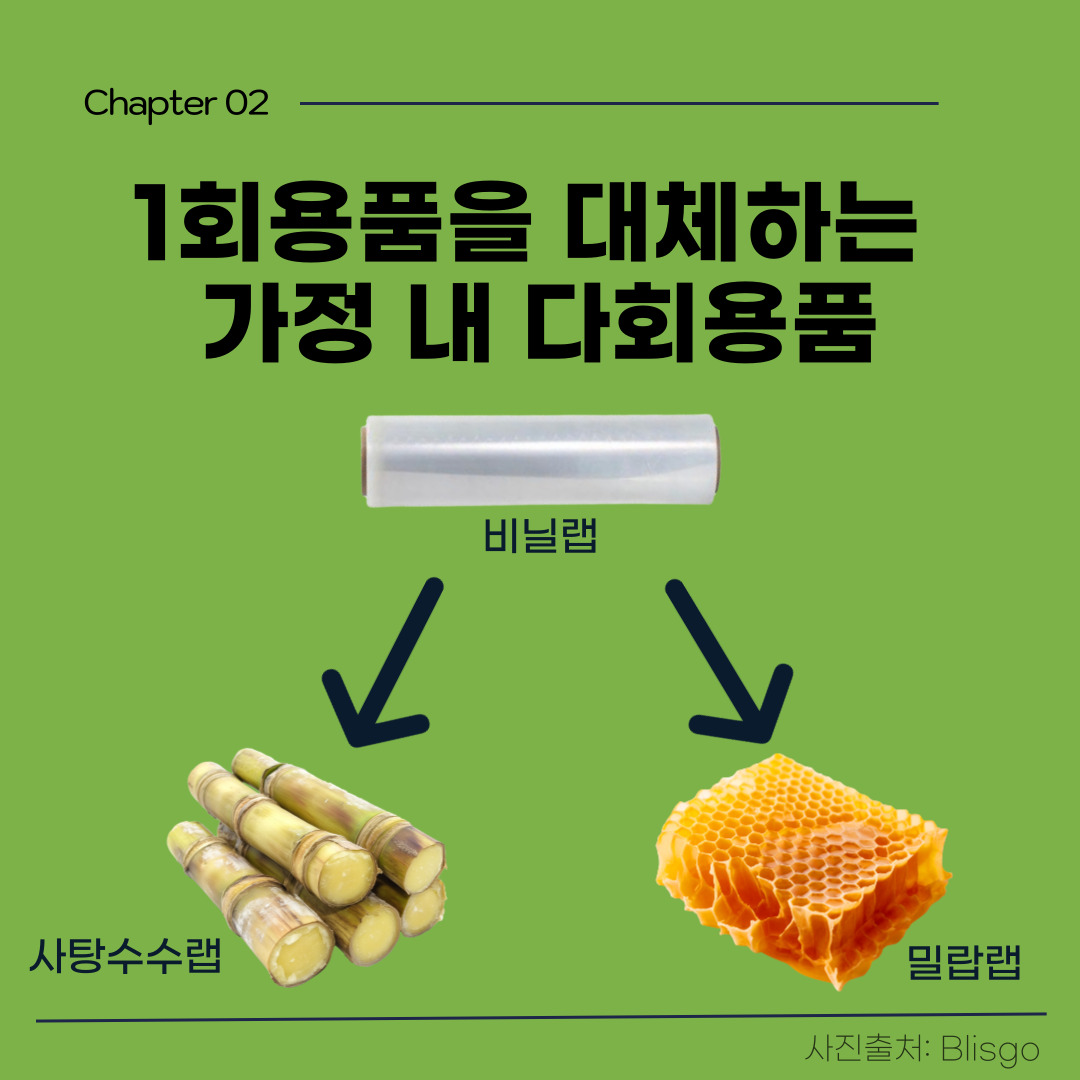 가정에서 자주 사용되는 1회용품도 다회용품으로 대체될 수 있습니다. 가정 내 1회용품이 가장 많이 사용되는 곳은 바로 주방인데요. 대표적으로 음식을 보관할 때 사용되는 비닐랩이 있습니다. 우리가 주로 사용하는 비닐랩은 대표적인 범용 열가소성 플라스틱인 PVC 재질로, 사용이 간편하지만, 일반 쓰레기로 배출되고 온실가스를 배출하는 1회용품입니다. 비닐랩을 대체할 다회용품으로는 사탕수수랩과 밀랍랩이 있습니다. 사탕수수랩은 사탕수수를 정제하고 남은 당밀로 만든 것으로, 비닐랩과 달리 열을 가해도 안전하고 약 70%의 탄소를 감소한다는 이점을 지녔습니다. 밀랍랩은 말 그대로 밀랍을 녹여 만든 것으로, 그릇을 덮는 덮개뿐만 아니라 식품을 보관하는 봉투로도 사용할 수 있어, 비닐로 만든 봉와 지퍼백을 대체할 수 있습니다.
