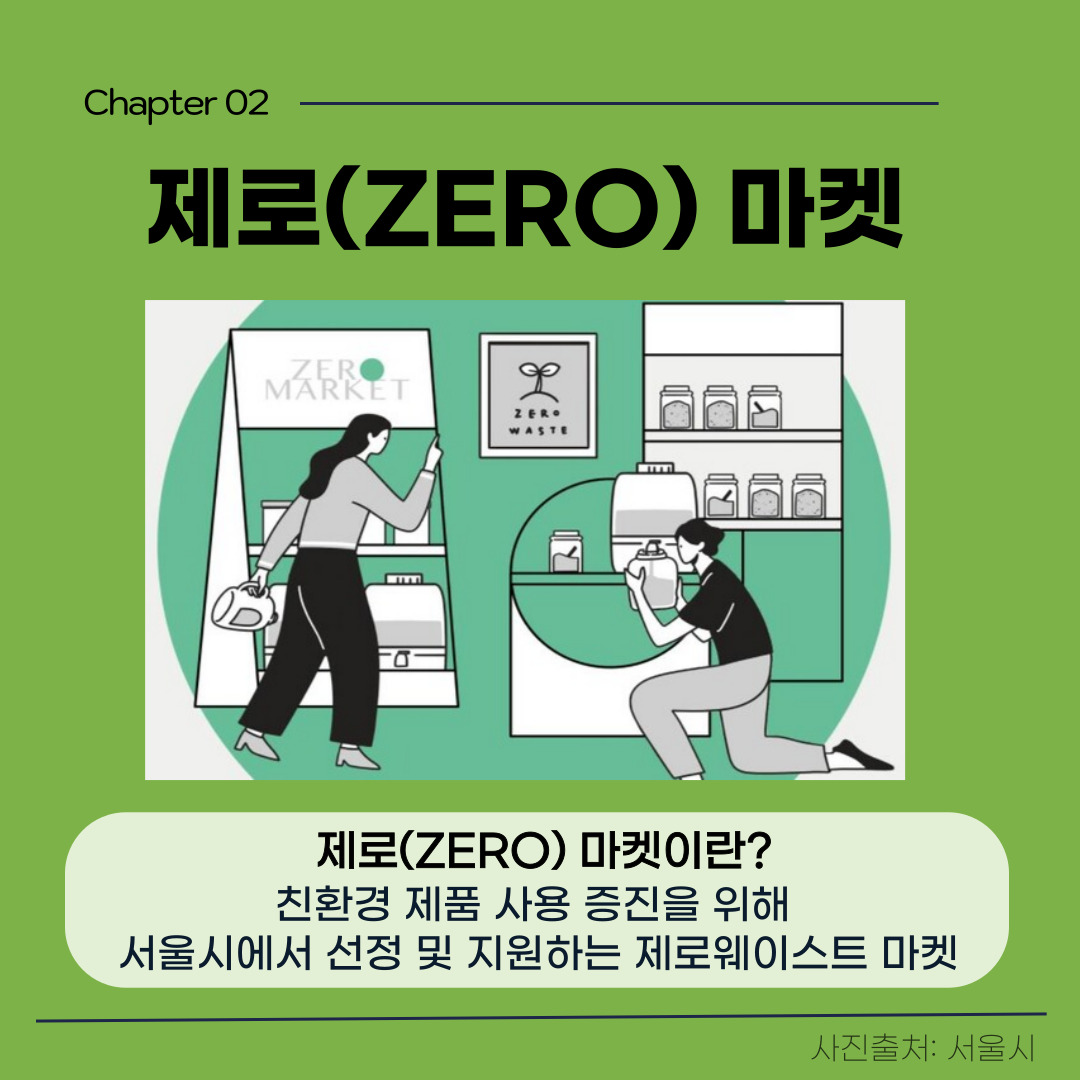 가정에서 실천할 수 있는 또 다른 방법으로 ‘제로(ZERO) 마켓’ 이용하기가 있습니다. 제로 마켓은 친환경 제품 사용 증진을 위해 매년 서울시에서 선정 및 지원하는 제로 웨이스트(Zero Waste) 마켓입니다. 제로 마켓은 세제, 샴푸, 화장품 등 리필이 가능한 제품을 구매할 때 필요한 만큼만 무게를 재서 살 수 있는 친환경 매장으로, 개인이 소지하고 있는 다회용품 혹은 매장 내 비치된 용기에 담아갈 수 있습니다. 개인의 제로 마켓 이용률 증가는 1회용품 포장재 사용을 줄이고 생활폐기물을 감소하는 데 도움을 줄 수 있습니다.