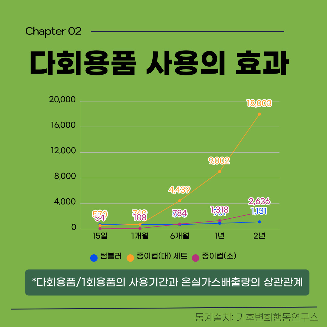 다회용품 사용은 탄소중립에 유의미한 효과를 불러올 수 있는데요. 기후변화행동연구소에 따르면, 텀블러를 장기간 사용했을 때 1회용 종이컵을 사용할 때보다 온실가스 배출량을 현저하게 낮출 수 있다는 연구 결과를 발표했습니다. 넷제로(Net-Zero), 즉 탄소중립을 만들어가는 첫 시작은 가정 내 ‘나’의 실천에서 비롯됩니다. 오늘 탄녹위 넷제로프렌즈와 함께 알아본 ‘가정 내 다회용품 사용’과 ‘다회용품 사용의 효과’가 여러분들의 친환경적인 실천에 도움이 되었길 바랍니다!