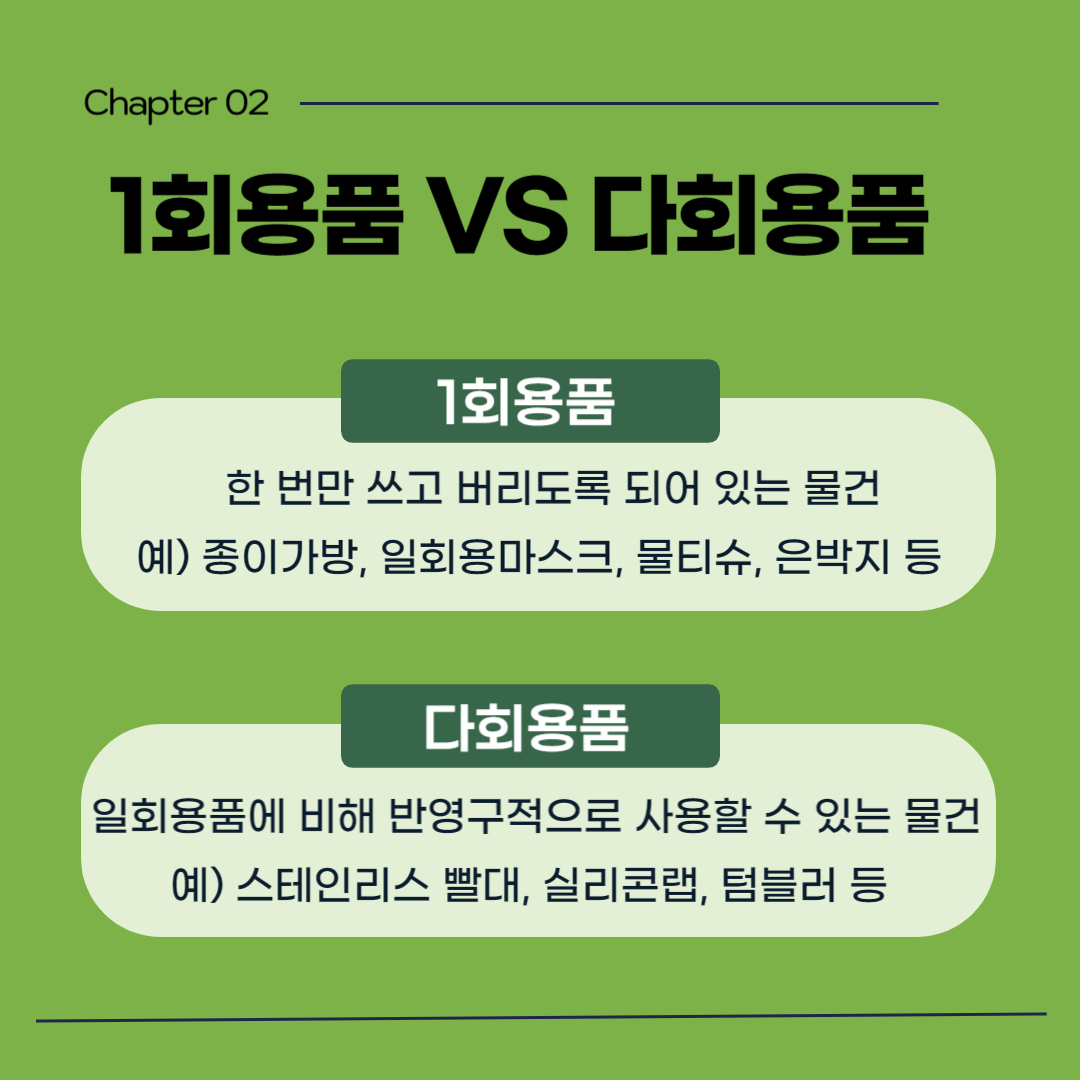 그렇다면, 1회용품과 다회용품의 차이점은 무엇일까요? 1회용품은 한 번만 쓰고 버리도록 되어있는 물건으로, 우리가 흔히 접하는 종이가방, 일회용 마스크, 물티슈, 은박지 등이 있습니다. 반면, 다회용품은 1회용품에 비해 반영구적으로 사용하는 물건입니다. 세척의 과정이 필요하다는 점이 있지만 1회용품과 달리 친환경적이고 자원낭비를 줄일 수 있다는 장점이 있습니다.