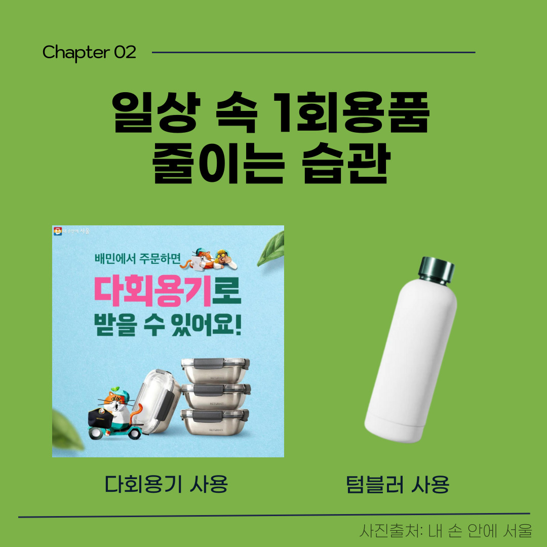 이외에도 일상 속 1회용품 줄이는 습관을 기르는 것이 중요합니다. 코로나19 팬데믹 이후 배달음식 사업이 확장되면서 1회용품 포장용기 사용도 증가하고 있는데요. 배달앱 업계에서도 환경을 고려하는 사회적 흐름에 발맞춰 배달앱 내 다회용기를 사용할 수 있는 옵션이 등장하는 등, 다회용기 사용을 장려하고 있습니다. 더불어 각종 SNS에서 환경호르몬과 1회용품 감소 증진을 위해 개인의 다회용기 사용 챌린지 인증도 등장하고 있습니다. 여러분들도 음료 및 음식을 테이크아웃(Take-out)할 때, 다회용기와 텀블러를 사용해 보는 건 어떠신가요?