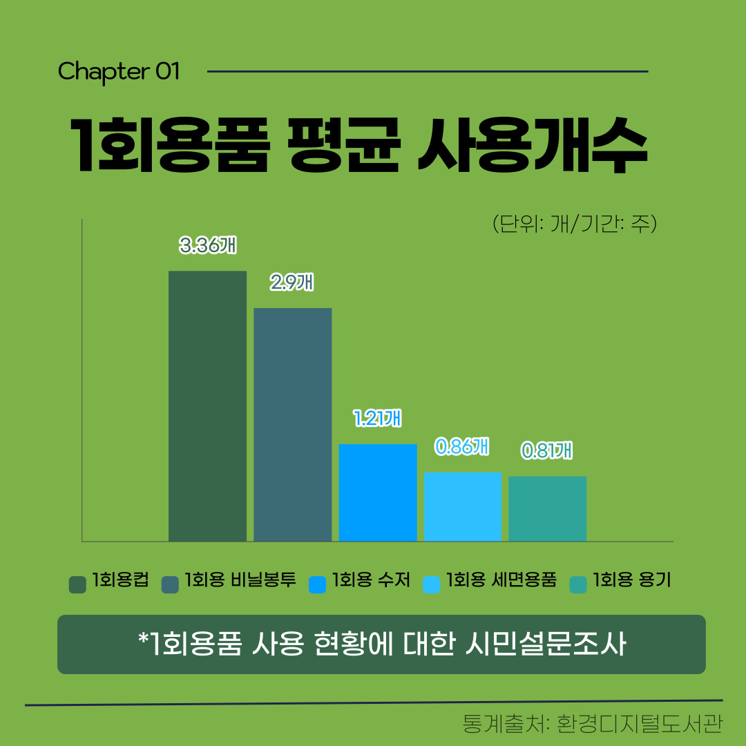 1회용품은 우리의 일상에서 많이 찾아볼 수 있는데요. 환경부의 1회용품 사용 현황에 대한 시민설문조사에 따르면, 한 주당 1회용품 사용 개수는 1회용컵이 3.36개로 가장 높았고, 1회용 비닐봉지, 1회용 수저, 1회용 세면용품, 1회용 용기 순으로 많이 사용되고 있습니다.