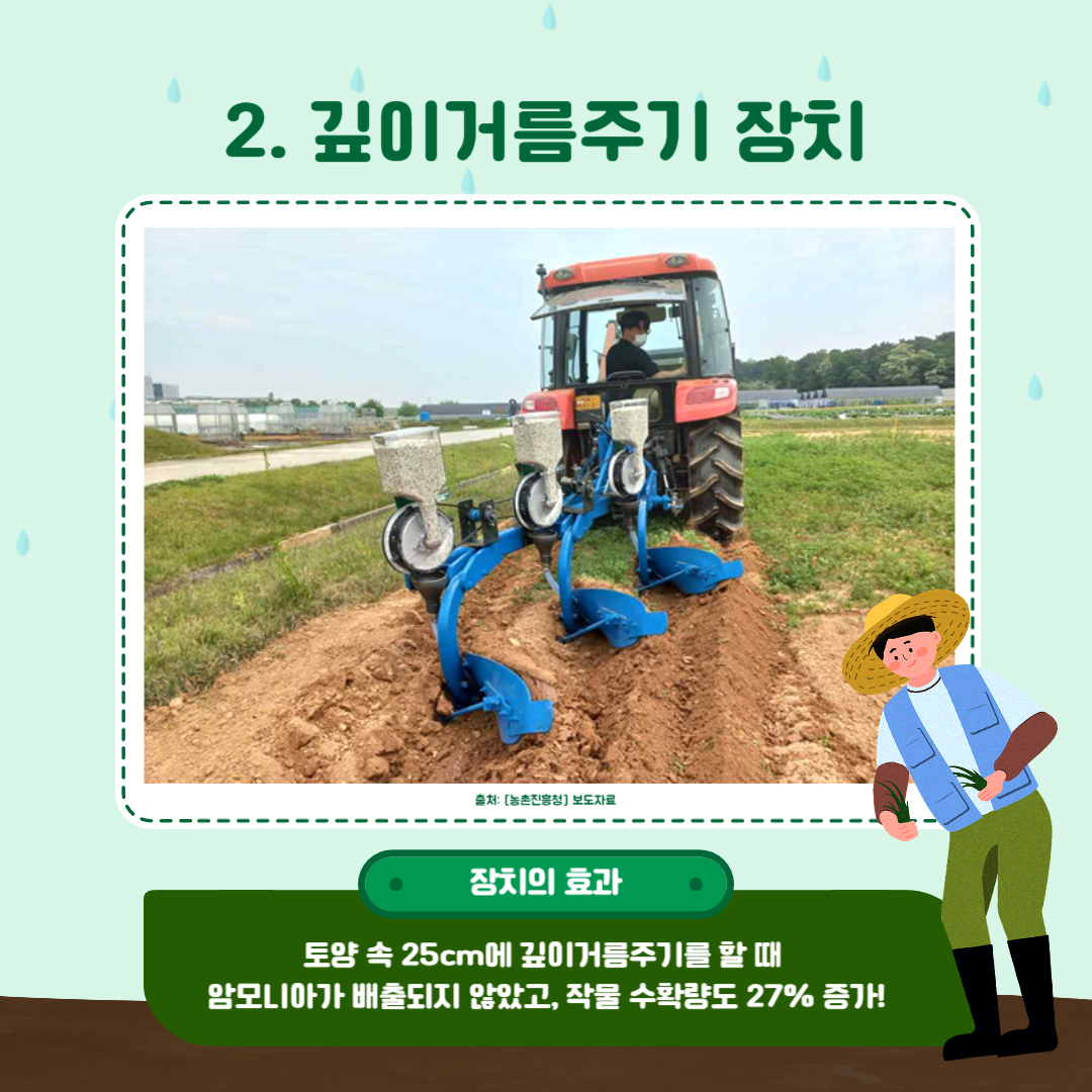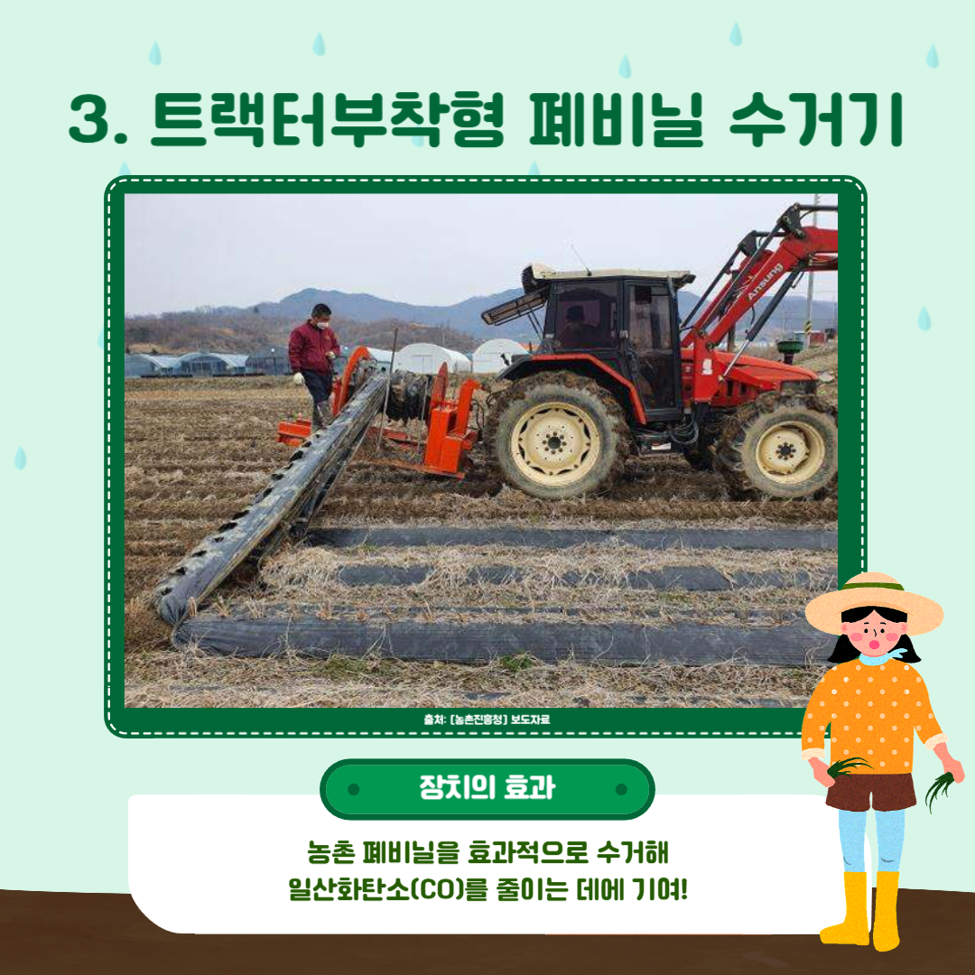 이는 농촌 환경오염을 예방할 필요성을 제기하기도 하는데요, 농촌진흥청은 영농활동으로 발생하는 탄소배출을 줄이기 위해 두 가지 농업 신기술을 개발하였습니다. 먼저 깊이거름주기 장치입니다. 농업에서는 관행적으로 흙의 겉에 비료를 공급하는 방식을 통해왔으나, 이러한 방법은 암모니아를 더 많이 발생시키고, 비료 사용의 효율도 떨어뜨립니다. 그러나 깊이거름주기 장치를 활용해 토양 속에 비료를 공급하면, 암모니아가 배출되지 않고 작물 수확량도 늘릴 수 있습니다. 트랙터부착형 폐비닐 수거기는 일산화탄소 절감을 위한 기술입니다. 트랙터에 기계를 부착하여, 노동력을 줄이고 비효율적인 활용을 개선할 수 있습니다. 이러한 생력화 기술을 통해 궁극적으로 농업 폐비닐의 수거량을 높이고 환경오염 물질을 줄일 수 있습니다.