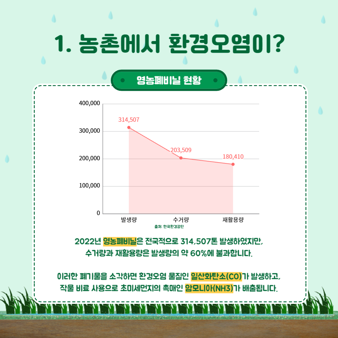 최근 심각해지는 기후 위기를 예방하기 위해 사회공동체의 활동이 필수가 되었습니다. 환경캠페인에 참가하고, 텀블러를 사용하는 등 개인의 몫이 예전보다 증가했습니다. 이러한 친환경 실천은 대부분 도시에서 이루어지는데요, 하지만 환경오염은 도시에서만 발생하는 것이 아닙니다. 농촌에서도 도시 못지않게 환경오염이 발생하고 있다는 사실, 알고 계시나요?