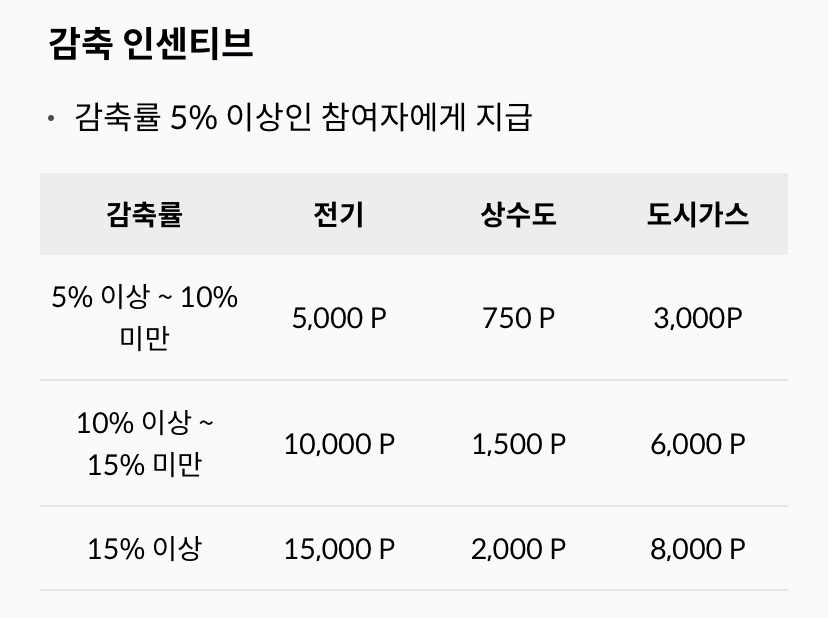 먼저 소개해 드릴 방법은 ‘그린카드 에코머니’인데요. 고객의 친환경적인 활동과 소비만큼의 혜택을 제공하는 포인트 리워드 서비스입니다. 그린카드는 환경부와 카드사가 제휴해 도입한 것으로, 친환경 소비 생활을 실천할 때마다 현금처럼 사용할 수 있는 에코머니 포인트를 적립해주는 카드입니다. 쉽게 말해 가정 내 에너지 사용량을 절감하거나, 친환경 제품을 구매하거나, 대중교통을 이용하는 등 환경에 도움이 되는 행동을 할 때 에코머니 포인트가 제공되는 것이지요. 그린카드에는 ‘어디로든 그린카드(V3)’, ‘그린카드 V2’, ‘그린카드 V1’ 이렇게 3종류가 있으며, 발급 은행과 세부 혜택에 조금씩 차이가 있으므로 자신에게 맞는 카드를 골라 쓰면 좋을 듯합니다. 그렇다면 그린카드 에코머니를 적립하는 방법에는 어떤 것들이 있을까요? 5월을 맞이한 만큼, 가정에서 포인트를 얻는 방법에 대해 알려드리겠습니다. 먼저 ‘탄소포인트제’에 대해 알아볼까요? 탄소포인트제는 서울시민을 제외한 전 국민을 대상으로 하며, 가정에서 사용하는 에너지 항목(전기, 상수도, 도시가스)의 과거 1~2년간 월별 평균 사용량과 현재 사용량을 비교한 뒤 절감비율에 따라 에코머니 포인트를 지급하는 제도입니다. 포인트를 지급하는 제도가 감축인센티브, 유지인센티브 2가지로 나뉘어 있으니 아래 테이블을 잘 봐두면 좋을 것 같아요.