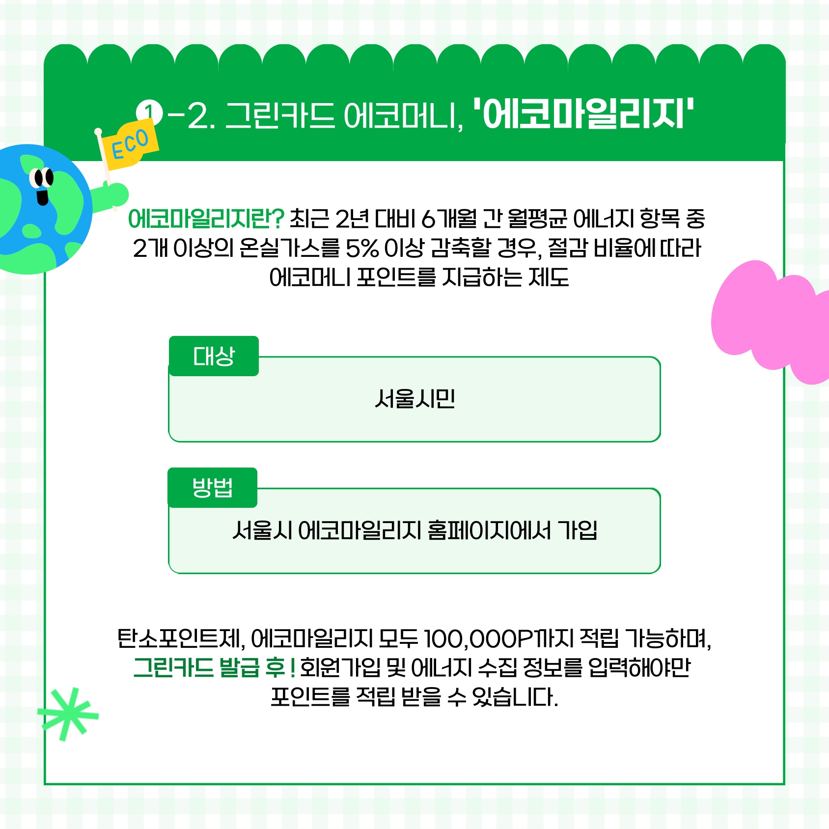 다음으로 ‘에코마일리지’는 서울시민만을 대상으로 하며, 최근 2년 대비 6개월간 월평균 에너지 항목 중 2개 이상의 온실가스를 5% 이상 감축할 경우, 절감 비율에 따라 에코머니 포인트를 지급하는 제도입니다. 오프라인으로 가입 시 ‘에코마일리지 가입 신청서’를 작성한 뒤 서울시내 시청, 구청, 주민 센터에 제출하면 되고, 방문이 어려운 경우 서울시 에코마일리지 홈페이지에서 온라인으로도 가입할 수 있습니다. (홈페이지 바로가기: https://ecomileage.seoul.go.kr) 두 제도 모두 연 최대 100,000P까지 적립 가능하다고 하니 가정 내 에너지를 조금씩 줄여 나가면 좋겠죠? 여기서 중요한 점, 반드시 “그린카드 발급 후” 회원가입 및 에너지 수집 정보를 입력해야만 포인트를 적립 받을 수 있답니다. 가입 전 그린카드 발급하기, 잊지 마세요! 가정 내 에너지 절약 외에도 에코머니 제휴 가맹점에서 그린카드로 친환경 제품을 구매할 때 금액의 최대 25%까지 적립 받을 수 있으며, 편의점부터 마트, 백화점에 이르기까지 다양한 매장에서 사용할 수 있습니다. 또 그린카드로 대중교통 이용 시 월 최대 10,000P까지 적립할 수 있다고 하니, 그린카드 하나 발급받아 두면 일상에서 요긴하게 사용할 수 있을 것 같네요!*더 많은 혜택과 서비스는 ‘그린카드’ 앱 내에서 확인하실 수 있습니다.