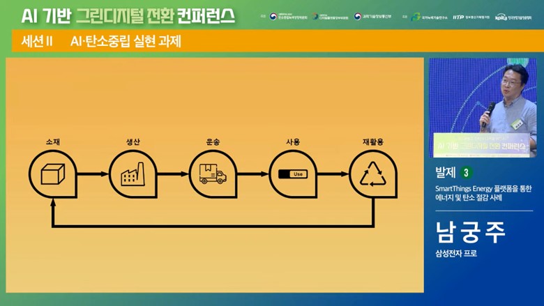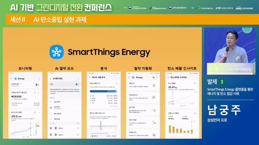 지난 4월 29일 대통령직속 2050 탄소중립녹색성장위원회(이하 탄녹위)에서 주최한 ‘AI 기반 그린디지털 전환 컨퍼런스’에서 답을 볼 수 있었습니다. 해당 컨퍼런스에서는 삼성전자 남궁주 프로가 SmartThings Energy 플랫폼을 활용한 에너지 및 탄소 절감 사례에 대해서 설명했습니다.