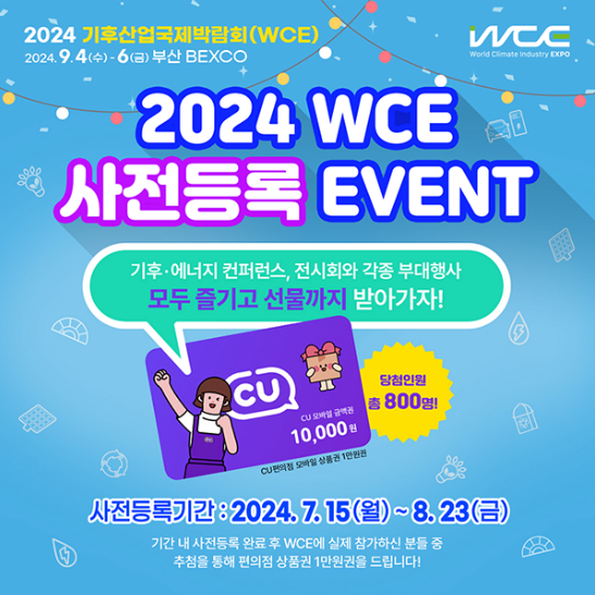 2024 기후산업국제박람회(World Climate Industry Expo:2024 WCE)는 기후 위기 대응을 위한 세계 기후산업 분야의 최신 기술과 정책을 선보이는 장(場)입니다. WCE는 지난 2023년 5월 개최 후 올해로 2회차를 맞았습니다. 산업통상자원부, 환경부, 대통령직속 2050 탄소중립녹색성장위원회 및 정부 부처 8개가 합동 주최하여 9월 3일(화)부터 9월 5일(목)까지 3일간 부산 해운대구 BEXCO에서 박람회가 열립니다. 이번 행사는 국내외 기후 에너지의 주요 인물들이 참여하여 다양한 형태의 발제 및 토론이 진행될 예정이며, 2024년 7월 15일(월) ~ 8월 23일(금)까지 사전 등록한 사람들에게 편의점 상품권을 제공합니다.