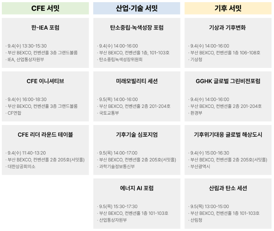 이번 WCE에서는 CFE 서밋, 산업·기술 서밋, 기후 서밋과 전시회 그리고 부대행사가 열립니다. 국제에너지기구(IEA) 사무총장 파티 비롤의 기조연설이 진행되고 산업통상자원부 안덕근 장관, 대통령직속 2050 탄소중립녹색성장위원회 김상협 위원장, 대한상공회의소 회장 최태원, 방송인 타일러 등 각계각층 전문가들과 실무진들이 참여합니다. 또한 이번 박람회는 무탄소에너지관을 포함한 총 5개의 전시회, 공공기관 채용설명회, 항만투어와 같은 다양한 부대행사 프로그램이 준비되어 있어 관심 있는 취준생과 관광객 모두 방문이 가능합니다.