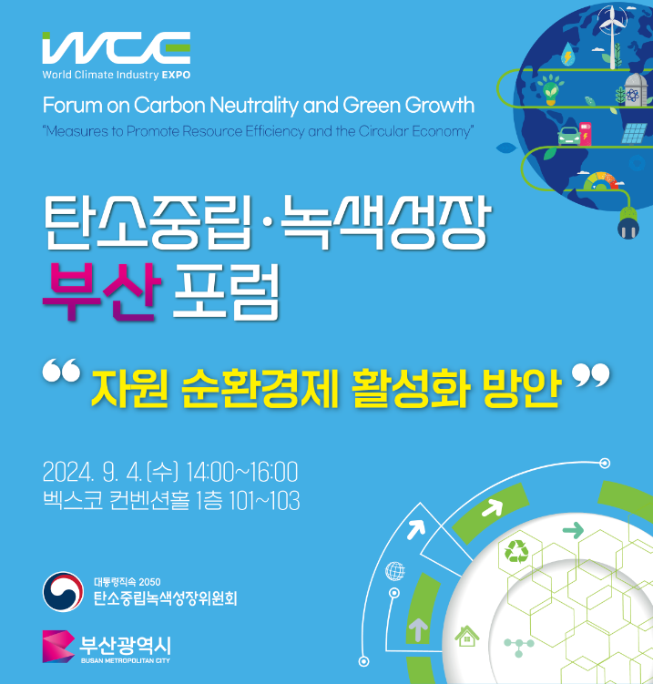 이에 더해 다가올 9월 부산 BEXCO에서 개최될 2024 WCE에서 탄녹위는 ‘자원 순환경제 활성화 방안’을 주제로 탄소중립·녹색성장 포럼을 선보일 예정입니다. 포럼은 9월 4일 수요일 부산 BEXCO 컨벤션홀에서 오후 2시부터 4시까지 진행될 예정입니다. 강홍윤 인하대학교 교수, 김호은 환경부 과장, 최윤찬 부산연구원 탄소중립지원센터 대외협력팀장, 신현석 탄녹위 공정전환·기후적응분과위원장, 이소라 한국환경연구원 자원순환연구장, 양승훈 경남대 교수, 이민종 LG화학 Circular 사업개발 부문 담당, 권기백 테라클 주식회사 대표이사 등 각계각층의 탄소중립·녹색성장 전문가들이 포럼에 참석하여 글로벌 녹색시장 공략 및 지역경제에 기여하는 글로컬 녹색산업 생태계 조성 방안에 대한 고견을 나누고 논의하는 시간이 될 것입니다.
