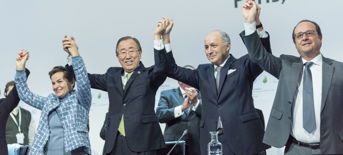 2015년 COP21에서 파리협정이 체결될 당시 환호하는 관계자들 (사진=UN)