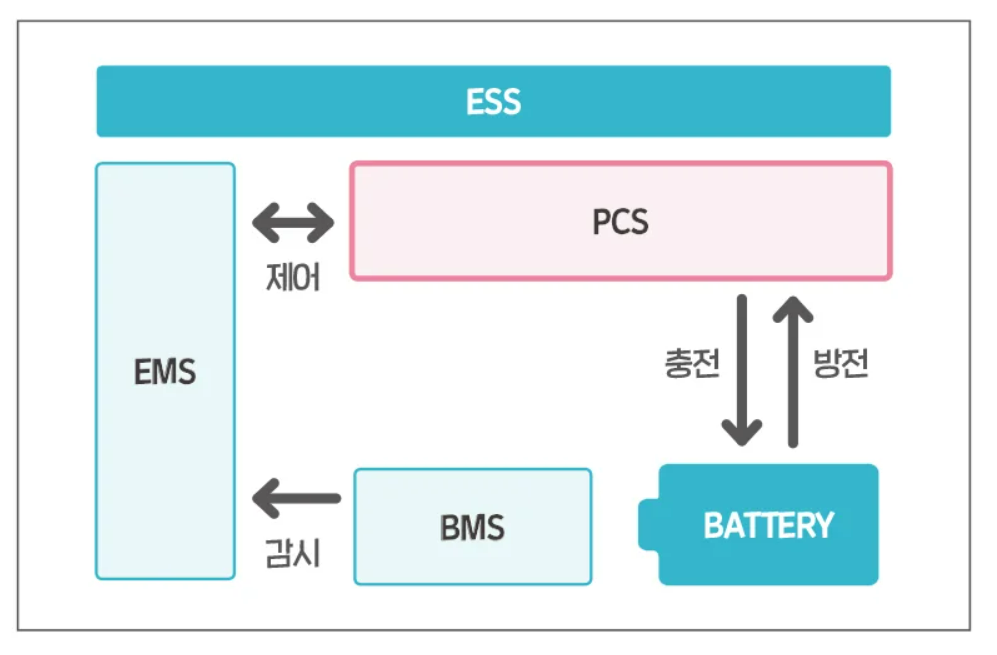 에너지 저장 시스템 ESS는 배터리, PCS, BMS, EMS 등 네 가지 주요 구성 요소로 이루어진다. 배터리는 전력을 저장하는 장치로, 저장 매체에 따라 다양한 종류가 있다. PCS(Power Conditioning System)는 교류 전기를 직류 전기로 변환해 배터리에 저장하고, 방전 시에는 반대로 직류 전기를 교류로 변환하는 양방향 인버터 역할을 한다. EMS(Energy Management System)는 ESS의 충전 및 방전 조건을 설정하고 모니터링, 제어 관리하는 프로그램이며, BMS(Battery Management System)는 배터리 관리 시스템을 담당한다.