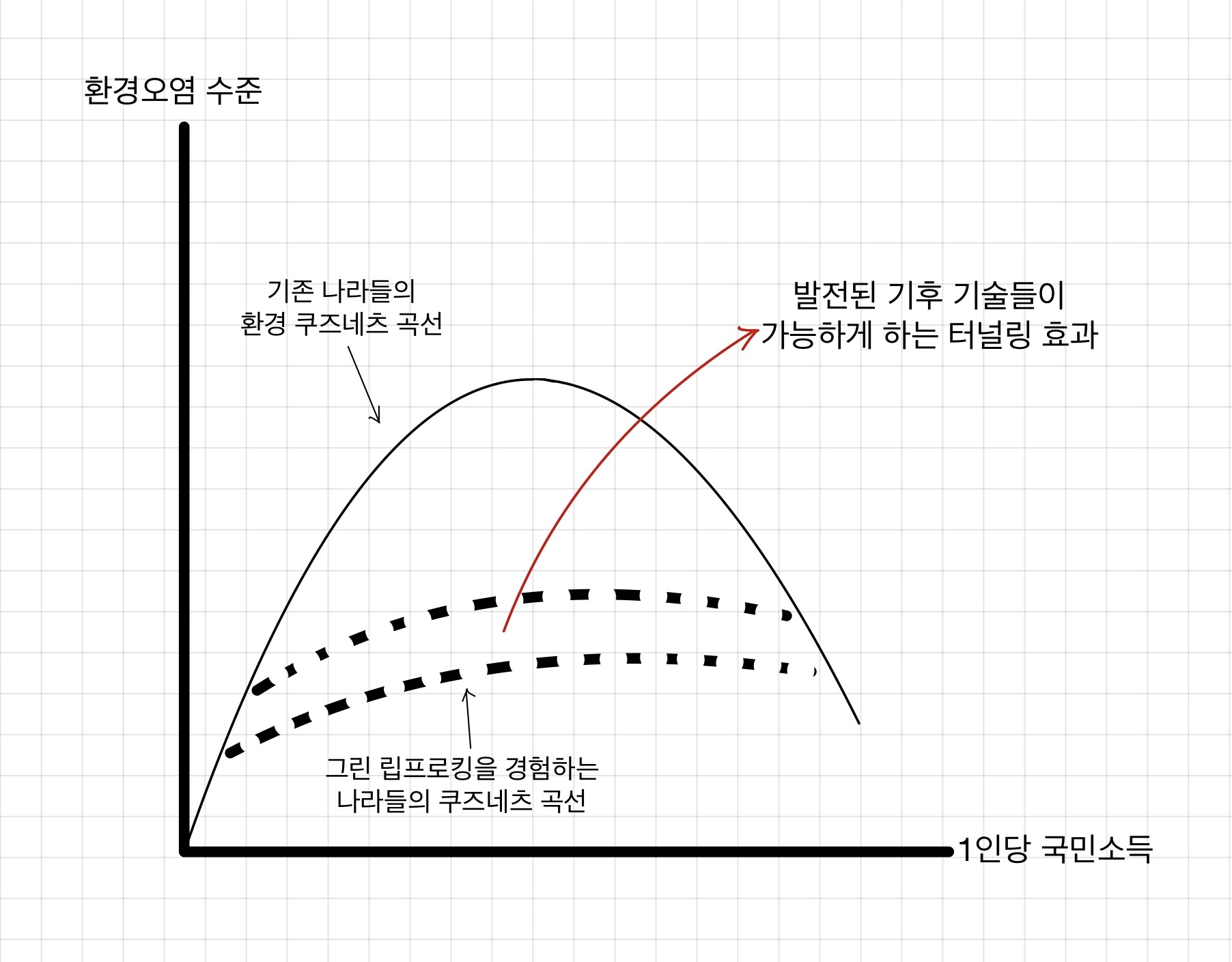 최근에 이러한 전통적인 환경 쿠즈네츠 곡선 이론에 그린 립프로깅(Green Leapfrogging)이라는 새로운 개념을 도입하려는 시도가 관측되고 있습니다. 개구리의 도약을 뜻하는 립프로깅은 기초부터 시작하여 단계를 밟아간 것이 아닌 특정 단계를 뛰어넘어 곧장 고도화 국면에 접어드는 것을 뜻합니다. 통신망이 취약한 국가 내 무선전화 보급이 유선전화 보급을 뛰어넘거나 신용카드 사용보다 빠르게 핸드폰을 통한 간편결제 시스템 보급 및 도입 등이 립프로깅의 대표적인 사례들입니다. 그린 립프로깅의 경우 저개발국가들이 나라 성장 단계의 일정 구간을 건너뛰어 선진국의 개발단계를 따라잡으며 전형적인 배출량과 경제의 관계를 따라가지 않는 것을 의미합니다. 그린 립프로깅이 가능한 이유는 ai를 접목한 기후기술, 발전된 태양광 패널 등 과거에는 없었던 첨단 녹색 기술들이 개발되었기 때문입니다.