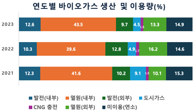 연도별 바이오가스 생산 및 이용량 현황(단위: %) (사진=한국폐기물협회, 기자 재구성)