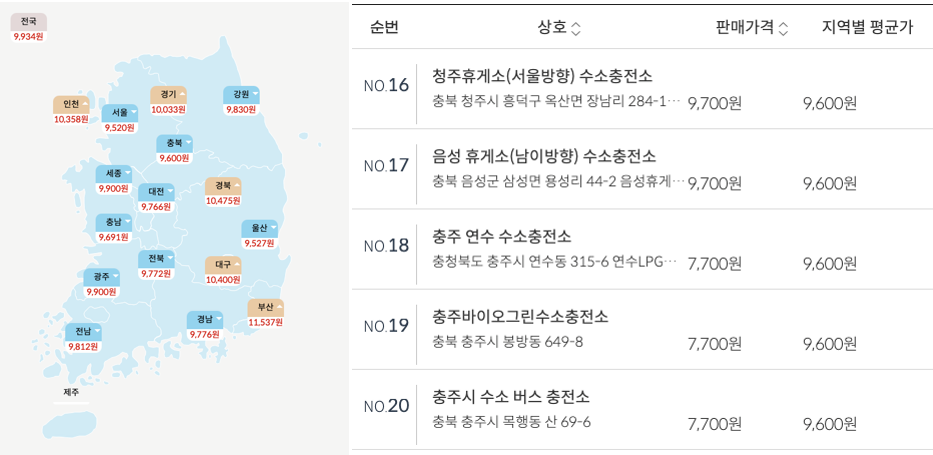 지역별 수소차 충전 가격 단가 및 충주시 판매가격 (사진=수소유통전담기관)