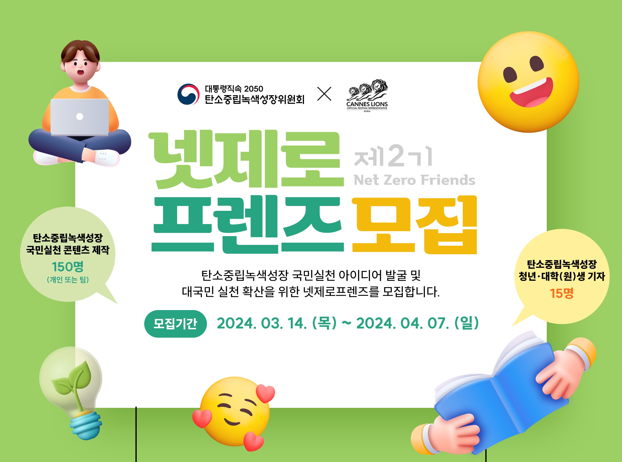 대통령직속 2050 탄소중립녹색성장위원회는 탄소중립녹생성장 대국민 실천 확산을 위해서 ‘넷제로 프렌즈’ 제2기를 2024년 4월 7일까지 모집했습니다. 넷제로프렌즈 2기는 탄소중립녹색성장 실천 아이디어 컨텐츠 제작(150명)과 청년·대학(원)생 기자(15명)로 구성되었습니다. 환경을 위해 작은 실천부터 큰 변화를 만들어가고자 하는 지원자들의 참여는 넷제로프렌즈 2기의 활동에 큰 동력을 불어넣었습니다. 이에 발돋움해 콘텐츠 제작 부문 및 기자 부문 멘토 총 8명은 넷제로프렌즈의 아이디어를 완성도 높은 콘텐츠로 제작하는 것을 도와줄 뿐만 아니라 전문가의 시각으로 정확한 피드백을 전달해 넷제로프렌즈의 콘텐츠 제작 실력을 향상시키는 데 기여했습니다.