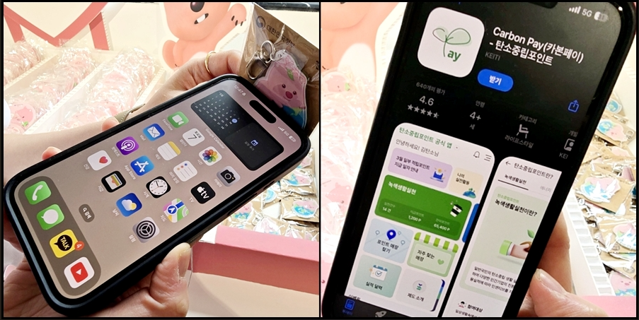 이제 위기와 실천 방법을 알게 됐으니 한 번 테스트를 해볼까요? 마지막 코너에는 ‘탄소중립 숨은 그림 찾기’를 해볼 수 있었습니다. 우리 집이나 사무실 중 선택하는 데 저는 우리 집을 선택했습니다. 곳곳에 숨겨져 있어 자세히 봐야 했어요. 냉장고에 음식을 많이 넣지 말기, 일회용 비닐 줄이기 등 일상생활에서 실천할 수 있는 것들이라 좀 더 공감되었습니다. 특히 체험을 마치고 받은 선물이 귀엽고 의미도 있었는데요. 잔망루피가 그려진 NFC 키링과 친환경 펄프 수세미였습니다. NFC 키링은 휴대전화에 인식하면 바로 카본페이 앱으로 연결된다고 합니다. 저는 아쉽게도 선착순으로 빨리 마감되어 받을 수 없었지만, 안내자가 시범을 보여주셨어요. 이 NFC 키링을 핸드폰에 태그하니 카본페이 앱으로 연결되었습니다.