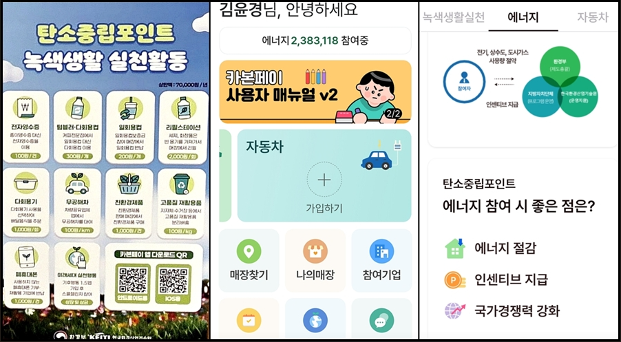 카본페이 앱은 녹색생활 실천, 에너지, 자동차 등으로 나누어져 있습니다. 탄소중립 포인트는 전자영수증, 텀블러(다회용 컵), 무공해차 등 녹색생활 실천 활동을 할 경우 적립이 됩니다. 연간 70,000원까지 적립된다고 하니, 지구도 보호하고 현금도 받고 꼭 설치하고 실천해 보시기 바랍니다.