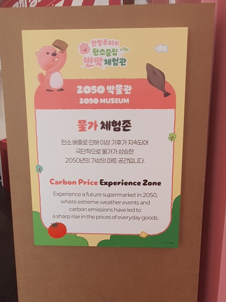 체험관의 하이라이트 중 하나는 잔망루피의 추억의 사생활을 주제로 한 전시였습니다. 이곳에서는 탄소중립 실천이 이루어지지 않을 경우 2050년 우리의 일상이 어떻게 변할 수 있는지에 대한 경각심을 일깨워 주었습니다. 예를 들어, 이상기후로 인한 농산물 가격 상승을 체험할 수 있는 물가 상승존에서는 포도 한 송이가 14만원이 되는 미래를 가상 체험할 수 있었습니다.