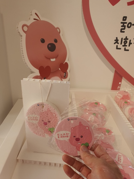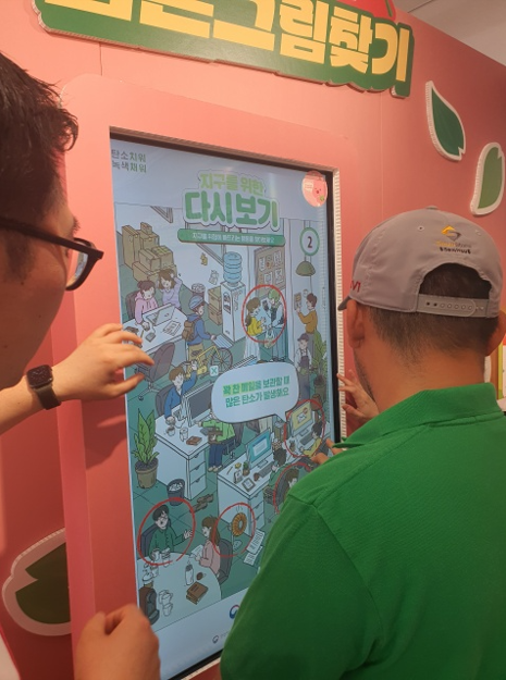 또한, 키오스크를 통해 사무실과 가정에서 탄소 배출을 줄이는 게임도 즐길 수 있었습니다. 해당 게임은 회사와 집 중 하나를 고르고, 탄소 배출을 과다하게 하는 행동을 선택하여 총 5~6개의 그림을 클릭하는 게임입니다. 해당 게임을 통해 받은 잔망루피 친환경 수세미 선물은 참여자들에게 큰 기쁨이었습니다.