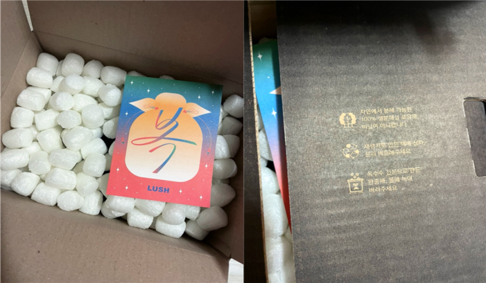 (LUSH)의 옥수수 전분으로 만든 완충재(사진=손성주 기자)
