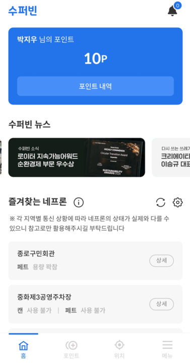 곧이어 앱 화면에는 포인트가 적립되었다. 단순한 안내 기능이 아니라 실제로 보상 체계가 작동하는 것이다. 수퍼빈 포인트는 현금으로 전환할 수 있어, ‘쓰레기도 돈이다, 재활용도 놀이다’라는 슬로건이 현실로 다가왔다. 버려지던 자원이 곧바로 가치로 환산되는 과정을 직접 경험하면서, 환경 보호라는 의무감뿐 아니라 합리적인 보상이 지속적인 참여 동기로 이어짐을 체감할 수 있었다.