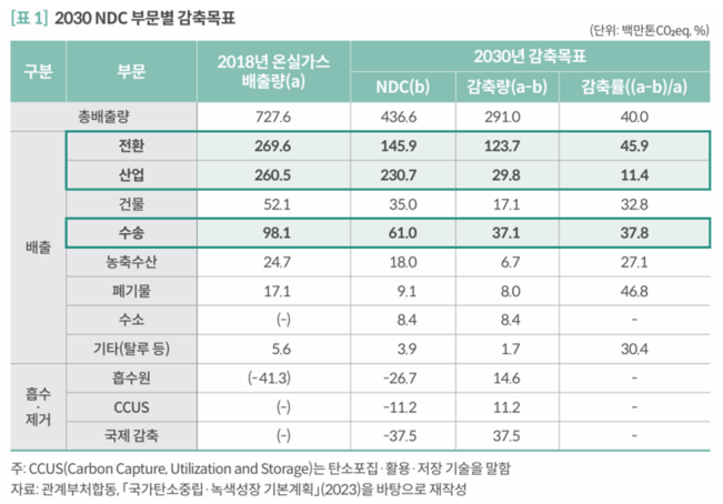 산업 부문은 국내 배출량의 30% 이상을 차지하는 또 다른 핵심축이다. 기존 2030 NDC 목표에서 산업 감축률을 다소 낮췄지만 여전히 제조업 중심의 산업구조 때문에 2035년 목표 상향에는 한계가 있다. 특히 철강·석유화학·시멘트 등 에너지 다소비 업종의 비중이 높고 감축 기술이 상용화되지 않은 상태에서 생산성 저하 없이 배출을 줄이기 어렵다는 구조적 문제가 존재한다. 정부가 추진 중인 탄소중립 지원정책은 대부분 R&D 중심으로 기술개발의 성패와 적용 시기가 2035 NDC 달성의 핵심 변수가 될 전망이다.