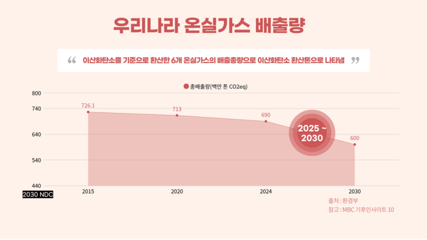 NDC 제출 시한은 파리협정 제3차라 할 수 있는 2025년 2월 10일로 정해져있다. 다만 실무상 많은 국가가 품질 보장을 위해 2025년 9월까지 제출 완료를 권고받은 상태지만 한국은 여전히 명확한 목표를 확정하지 못한 채 협의 중이다. 현재 정부는 2018년 대비 48%, 53%, 61%, 65% 감축 등 네 가지 시나리오를 두고 이해관계자 간 조율을 진행 중이다. 환경부가 발표한 잠정치에 따르면 2024년 한국의 온실가스 배출량은 약 6억9천만 톤으로 전년 대비 2%가량 감소했다. 그러나 이 속도라면 2030년까지 2018년 대비 40% 감축 목표를 달성하기는 쉽지 않다는 의견이다. 감축률을 높이기 위해서는 구조적 전환이 불가피하지만 전환·산업·수송 등 주요 부문 모두 구조적 한계와 정책적 부담 때문에 “목표는 높지만 실현 가능성은 불투명하다”는 평가가 나온다.